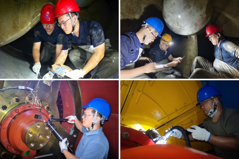 為確保機(jī)組始終處于良好備用狀態(tài),運(yùn)行人員對站內(nèi)電氣設(shè)備逐臺進(jìn)行絕緣電阻測試、回路通斷檢查,更換故障儀表、機(jī)組碳刷和老化零部件,校準(zhǔn)GIS設(shè)備溫度傳感器,形成了一套“測、查、換、?!钡摹敖M合拳”,確保電氣設(shè)備“零故障”運(yùn)行。運(yùn)行人員深入3#、4#、5#主機(jī)組內(nèi)部,在陰暗潮濕環(huán)境中對機(jī)組水下部分進(jìn)行全方位“體檢”,詳細(xì)測量記錄葉片間隙數(shù)據(jù),評估葉片、葉輪、流道、冷卻裝置部件腐蝕程度,對氣蝕、銹蝕、閥芯損壞等問題立行立改,通過精準(zhǔn)修復(fù)、部件更換、除銹防腐等方式方法,對關(guān)鍵部位進(jìn)行維修養(yǎng)護(hù),全面消除安全隱患,確保機(jī)組運(yùn)行效率與穩(wěn)定性。