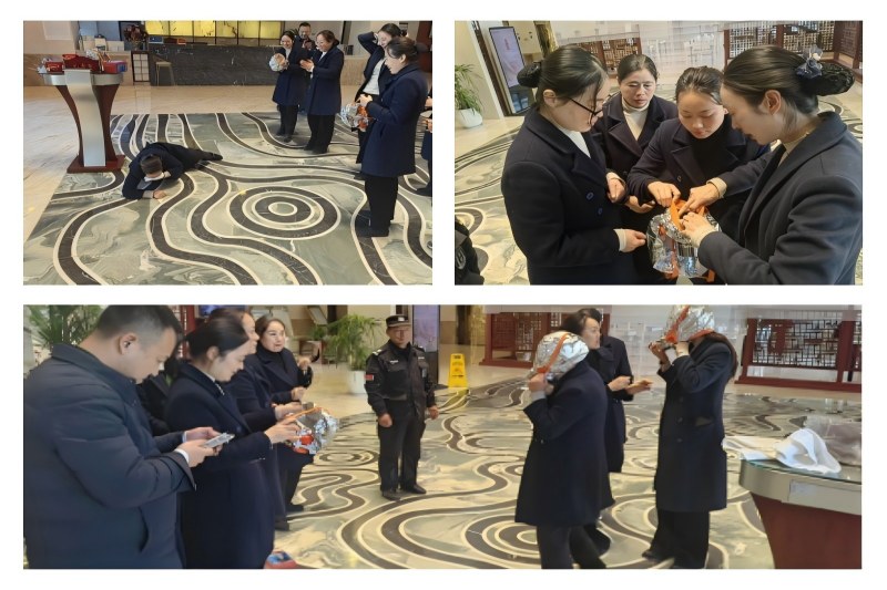 實操演練環(huán)節(jié)秩序井然,員工分組反復(fù)練習(xí)消防器材使用技巧,工程部人員現(xiàn)場指導(dǎo)糾正、解答疑問。針對客房、樓道等重點區(qū)域,工作人員講解疏散路線與技巧,強調(diào)需低姿彎腰、濕毛巾捂口鼻,避免擁擠踩踏,員工們認真模擬,熟練掌握逃生要領(lǐng)。